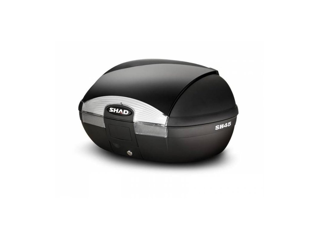 Atraktivní a robustní kufr značky SHAD typu TopCase s velkou kapacitou 45 litrů pro dvě Integrální helmy. Díky patentovanému systému zamykání Smart Lock System je možné TopCase SHAD SH45 jednoduše uzamknout a v případě potřeby rychle a bez nářadí sejmout z nosiče. Seriově se Topcase dodává bez lakovaného krytu. Na přání je možné vybavit zádovou opěrkou, brzdovým světlem pod nosič a případně krytem jiné barvy. TopCase je standardně dodáván s upínací plotnou (adaptérem) a sadou montážního materiálu, což zajišťuje optimální jednoduchou montáž na téměř všechny typy skútrů a motocyklů.