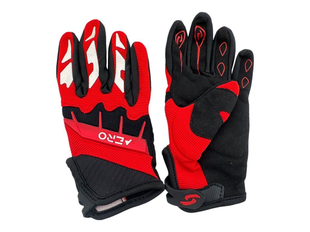 Detské motokrosové rukavice AERO v oranžovej farbe. Tieto ľahké a pružné rukavice od spoločnosti AERO pre deti a mládež majú silikónovú potlač na prstoch aj na dlaniach, čo zaisťuje lepší úchop a dobrú kontrolu nad gripmi a ovládacími prvkami. Vzduch prepúšťajúce sieťové vložky na hornej strane dlane zaisťujú lepšiu cirkuláciu vzduchu vo vnútri rukavice. Vložky z termoplastického elastoméru na povrchu týchto rukavíc poskytujú dodatočnú ochranu, napr. pred lietajúcimi kamienkami alebo vetvičkami. Nastaviteľné zapínanie na suchý zips na zápästí zaisťuje dokonalé prispôsobenie daným rukám. Vložky z elastickej lycry na oboch stranách prstov vedú k väčšiemu pohodliu pri nosení a pružnosti, a zlepšujú tak pohyblivosť. Oblasti použitia: Moto Cross, Downhill, Mountain Bike, Enduro, Offroad, ATV, Quad a mnoho ďalšieho.